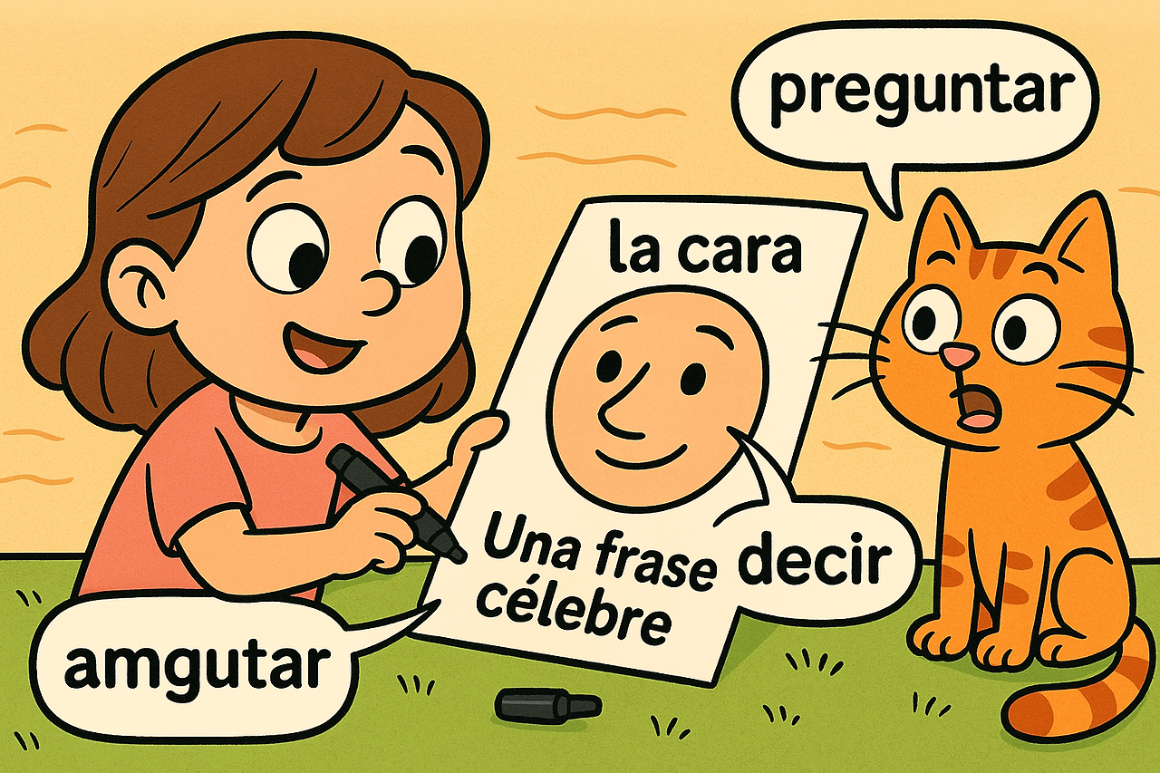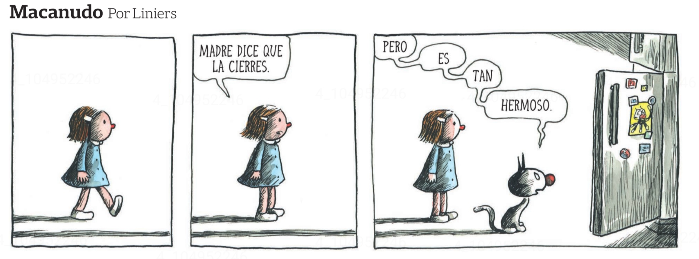 단어:la cara 얼굴, la frase 문장, célebre 유명한, la nariz 코, el marcador 마커, la niña 소녀, el gato 고양이, preguntar 묻다, decir 말하다, hacer 하다 문장:왜 얼굴에 그런 짓을 한 거야?"내가 말하는 모든 게 명언이 되기를 원해."엔리께 * 그림에는 일부 오류가 있을 수 있습니다. 본문과 비교하면서 공부하세요.* 이 콘텐츠는 리니에르스의 만화 Macanudo를 참고했습니다.
